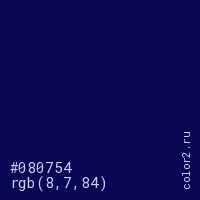 Цвет #080754 в цветовой модели RGB обозначается тремя октетами (8, 7, 84) в десятичном формате и #080754 в шестнадцатиричном (hex) формате, которые являются интенсивностью красного 8 (hex 08), интенсивность зелёного 7 (hex 07) и интенсивность синего 84 (hex 54).