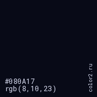 Цвет #080A17 в цветовой модели RGB обозначается тремя октетами (8, 10, 23) в десятичном формате и #080A17 в шестнадцатиричном (hex) формате, которые являются интенсивностью красного 8 (hex 08), интенсивность зелёного 10 (hex 0A) и интенсивность синего 23 (hex 17).