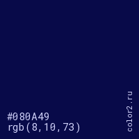 Цвет #080A49 в цветовой модели RGB обозначается тремя октетами (8, 10, 73) в десятичном формате и #080A49 в шестнадцатиричном (hex) формате, которые являются интенсивностью красного 8 (hex 08), интенсивность зелёного 10 (hex 0A) и интенсивность синего 73 (hex 49).