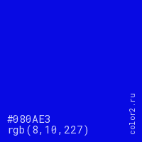 Цвет #080AE3 в цветовой модели RGB обозначается тремя октетами (8, 10, 227) в десятичном формате и #080AE3 в шестнадцатиричном (hex) формате, которые являются интенсивностью красного 8 (hex 08), интенсивность зелёного 10 (hex 0A) и интенсивность синего 227 (hex E3).