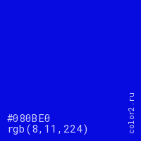 Цвет #080BE0 в цветовой модели RGB обозначается тремя октетами (8, 11, 224) в десятичном формате и #080BE0 в шестнадцатиричном (hex) формате, которые являются интенсивностью красного 8 (hex 08), интенсивность зелёного 11 (hex 0B) и интенсивность синего 224 (hex E0).