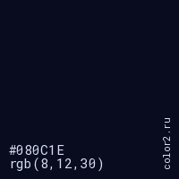 Цвет #080C1E в цветовой модели RGB обозначается тремя октетами (8, 12, 30) в десятичном формате и #080C1E в шестнадцатиричном (hex) формате, которые являются интенсивностью красного 8 (hex 08), интенсивность зелёного 12 (hex 0C) и интенсивность синего 30 (hex 1E).