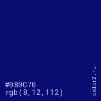 Цвет #080C70 в цветовой модели RGB обозначается тремя октетами (8, 12, 112) в десятичном формате и #080C70 в шестнадцатиричном (hex) формате, которые являются интенсивностью красного 8 (hex 08), интенсивность зелёного 12 (hex 0C) и интенсивность синего 112 (hex 70).