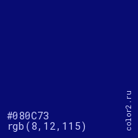 Цвет #080C73 в цветовой модели RGB обозначается тремя октетами (8, 12, 115) в десятичном формате и #080C73 в шестнадцатиричном (hex) формате, которые являются интенсивностью красного 8 (hex 08), интенсивность зелёного 12 (hex 0C) и интенсивность синего 115 (hex 73).