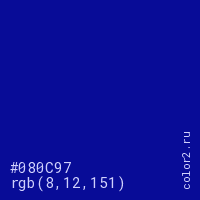 Цвет #080C97 в цветовой модели RGB обозначается тремя октетами (8, 12, 151) в десятичном формате и #080C97 в шестнадцатиричном (hex) формате, которые являются интенсивностью красного 8 (hex 08), интенсивность зелёного 12 (hex 0C) и интенсивность синего 151 (hex 97).
