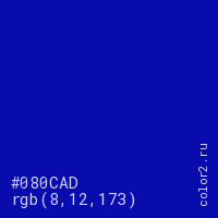Цвет #080CAD в цветовой модели RGB обозначается тремя октетами (8, 12, 173) в десятичном формате и #080CAD в шестнадцатиричном (hex) формате, которые являются интенсивностью красного 8 (hex 08), интенсивность зелёного 12 (hex 0C) и интенсивность синего 173 (hex AD).