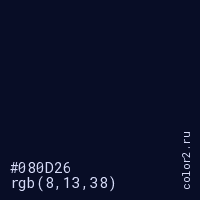 Цвет #080D26 в цветовой модели RGB обозначается тремя октетами (8, 13, 38) в десятичном формате и #080D26 в шестнадцатиричном (hex) формате, которые являются интенсивностью красного 8 (hex 08), интенсивность зелёного 13 (hex 0D) и интенсивность синего 38 (hex 26).