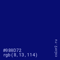 Цвет #080D72 в цветовой модели RGB обозначается тремя октетами (8, 13, 114) в десятичном формате и #080D72 в шестнадцатиричном (hex) формате, которые являются интенсивностью красного 8 (hex 08), интенсивность зелёного 13 (hex 0D) и интенсивность синего 114 (hex 72).