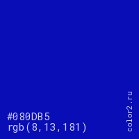 Цвет #080DB5 в цветовой модели RGB обозначается тремя октетами (8, 13, 181) в десятичном формате и #080DB5 в шестнадцатиричном (hex) формате, которые являются интенсивностью красного 8 (hex 08), интенсивность зелёного 13 (hex 0D) и интенсивность синего 181 (hex B5).