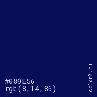 Цвет #080E56 в цветовой модели RGB обозначается тремя октетами (8, 14, 86) в десятичном формате и #080E56 в шестнадцатиричном (hex) формате, которые являются интенсивностью красного 8 (hex 08), интенсивность зелёного 14 (hex 0E) и интенсивность синего 86 (hex 56).