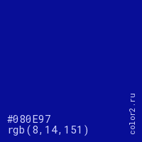 Цвет #080E97 в цветовой модели RGB обозначается тремя октетами (8, 14, 151) в десятичном формате и #080E97 в шестнадцатиричном (hex) формате, которые являются интенсивностью красного 8 (hex 08), интенсивность зелёного 14 (hex 0E) и интенсивность синего 151 (hex 97).