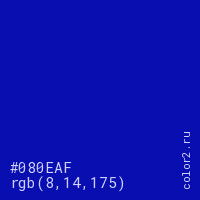 Цвет #080EAF в цветовой модели RGB обозначается тремя октетами (8, 14, 175) в десятичном формате и #080EAF в шестнадцатиричном (hex) формате, которые являются интенсивностью красного 8 (hex 08), интенсивность зелёного 14 (hex 0E) и интенсивность синего 175 (hex AF).