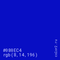 Цвет #080EC4 в цветовой модели RGB обозначается тремя октетами (8, 14, 196) в десятичном формате и #080EC4 в шестнадцатиричном (hex) формате, которые являются интенсивностью красного 8 (hex 08), интенсивность зелёного 14 (hex 0E) и интенсивность синего 196 (hex C4).