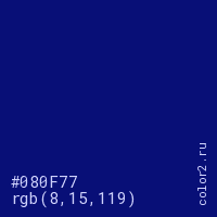 Цвет #080F77 в цветовой модели RGB обозначается тремя октетами (8, 15, 119) в десятичном формате и #080F77 в шестнадцатиричном (hex) формате, которые являются интенсивностью красного 8 (hex 08), интенсивность зелёного 15 (hex 0F) и интенсивность синего 119 (hex 77).