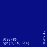 Цвет #080F86 в цветовой модели RGB обозначается тремя октетами (8, 15, 134) в десятичном формате и #080F86 в шестнадцатиричном (hex) формате, которые являются интенсивностью красного 8 (hex 08), интенсивность зелёного 15 (hex 0F) и интенсивность синего 134 (hex 86).