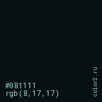 Цвет #081111 в цветовой модели RGB обозначается тремя октетами (8, 17, 17) в десятичном формате и #081111 в шестнадцатиричном (hex) формате, которые являются интенсивностью красного 8 (hex 08), интенсивность зелёного 17 (hex 11) и интенсивность синего 17 (hex 11).