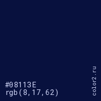 Цвет #08113E в цветовой модели RGB обозначается тремя октетами (8, 17, 62) в десятичном формате и #08113E в шестнадцатиричном (hex) формате, которые являются интенсивностью красного 8 (hex 08), интенсивность зелёного 17 (hex 11) и интенсивность синего 62 (hex 3E).