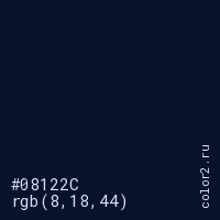 Цвет #08122C в цветовой модели RGB обозначается тремя октетами (8, 18, 44) в десятичном формате и #08122C в шестнадцатиричном (hex) формате, которые являются интенсивностью красного 8 (hex 08), интенсивность зелёного 18 (hex 12) и интенсивность синего 44 (hex 2C).