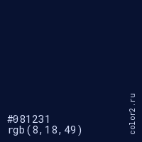 Цвет #081231 в цветовой модели RGB обозначается тремя октетами (8, 18, 49) в десятичном формате и #081231 в шестнадцатиричном (hex) формате, которые являются интенсивностью красного 8 (hex 08), интенсивность зелёного 18 (hex 12) и интенсивность синего 49 (hex 31).