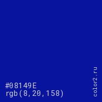 Цвет #08149E в цветовой модели RGB обозначается тремя октетами (8, 20, 158) в десятичном формате и #08149E в шестнадцатиричном (hex) формате, которые являются интенсивностью красного 8 (hex 08), интенсивность зелёного 20 (hex 14) и интенсивность синего 158 (hex 9E).