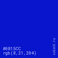 Цвет #0815CC в цветовой модели RGB обозначается тремя октетами (8, 21, 204) в десятичном формате и #0815CC в шестнадцатиричном (hex) формате, которые являются интенсивностью красного 8 (hex 08), интенсивность зелёного 21 (hex 15) и интенсивность синего 204 (hex CC).