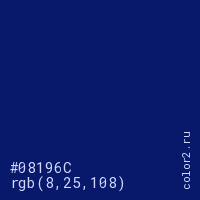 Цвет #08196C в цветовой модели RGB обозначается тремя октетами (8, 25, 108) в десятичном формате и #08196C в шестнадцатиричном (hex) формате, которые являются интенсивностью красного 8 (hex 08), интенсивность зелёного 25 (hex 19) и интенсивность синего 108 (hex 6C).