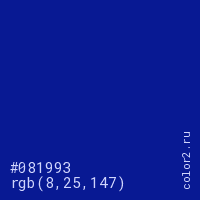 Цвет #081993 в цветовой модели RGB обозначается тремя октетами (8, 25, 147) в десятичном формате и #081993 в шестнадцатиричном (hex) формате, которые являются интенсивностью красного 8 (hex 08), интенсивность зелёного 25 (hex 19) и интенсивность синего 147 (hex 93).