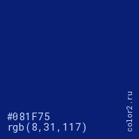 Цвет #081F75 в цветовой модели RGB обозначается тремя октетами (8, 31, 117) в десятичном формате и #081F75 в шестнадцатиричном (hex) формате, которые являются интенсивностью красного 8 (hex 08), интенсивность зелёного 31 (hex 1F) и интенсивность синего 117 (hex 75).