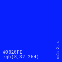 Цвет #0820FE в цветовой модели RGB обозначается тремя октетами (8, 32, 254) в десятичном формате и #0820FE в шестнадцатиричном (hex) формате, которые являются интенсивностью красного 8 (hex 08), интенсивность зелёного 32 (hex 20) и интенсивность синего 254 (hex FE).