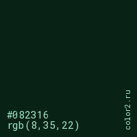 Цвет #082316 в цветовой модели RGB обозначается тремя октетами (8, 35, 22) в десятичном формате и #082316 в шестнадцатиричном (hex) формате, которые являются интенсивностью красного 8 (hex 08), интенсивность зелёного 35 (hex 23) и интенсивность синего 22 (hex 16).