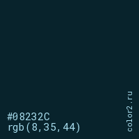 Цвет #08232C в цветовой модели RGB обозначается тремя октетами (8, 35, 44) в десятичном формате и #08232C в шестнадцатиричном (hex) формате, которые являются интенсивностью красного 8 (hex 08), интенсивность зелёного 35 (hex 23) и интенсивность синего 44 (hex 2C).