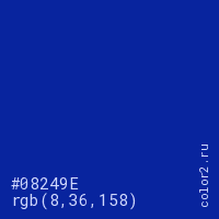Цвет #08249E в цветовой модели RGB обозначается тремя октетами (8, 36, 158) в десятичном формате и #08249E в шестнадцатиричном (hex) формате, которые являются интенсивностью красного 8 (hex 08), интенсивность зелёного 36 (hex 24) и интенсивность синего 158 (hex 9E).
