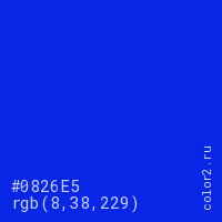 Цвет #0826E5 в цветовой модели RGB обозначается тремя октетами (8, 38, 229) в десятичном формате и #0826E5 в шестнадцатиричном (hex) формате, которые являются интенсивностью красного 8 (hex 08), интенсивность зелёного 38 (hex 26) и интенсивность синего 229 (hex E5).