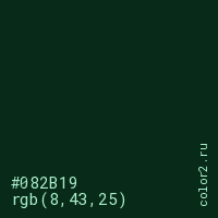 Цвет #082B19 в цветовой модели RGB обозначается тремя октетами (8, 43, 25) в десятичном формате и #082B19 в шестнадцатиричном (hex) формате, которые являются интенсивностью красного 8 (hex 08), интенсивность зелёного 43 (hex 2B) и интенсивность синего 25 (hex 19).