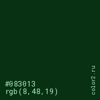 Цвет #083013 в цветовой модели RGB обозначается тремя октетами (8, 48, 19) в десятичном формате и #083013 в шестнадцатиричном (hex) формате, которые являются интенсивностью красного 8 (hex 08), интенсивность зелёного 48 (hex 30) и интенсивность синего 19 (hex 13).