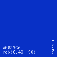 Цвет #0830C6 в цветовой модели RGB обозначается тремя октетами (8, 48, 198) в десятичном формате и #0830C6 в шестнадцатиричном (hex) формате, которые являются интенсивностью красного 8 (hex 08), интенсивность зелёного 48 (hex 30) и интенсивность синего 198 (hex C6).
