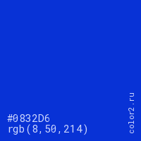 Цвет #0832D6 в цветовой модели RGB обозначается тремя октетами (8, 50, 214) в десятичном формате и #0832D6 в шестнадцатиричном (hex) формате, которые являются интенсивностью красного 8 (hex 08), интенсивность зелёного 50 (hex 32) и интенсивность синего 214 (hex D6).