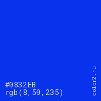 Цвет #0832EB в цветовой модели RGB обозначается тремя октетами (8, 50, 235) в десятичном формате и #0832EB в шестнадцатиричном (hex) формате, которые являются интенсивностью красного 8 (hex 08), интенсивность зелёного 50 (hex 32) и интенсивность синего 235 (hex EB).