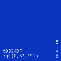 Цвет #0834BF в цветовой модели RGB обозначается тремя октетами (8, 52, 191) в десятичном формате и #0834BF в шестнадцатиричном (hex) формате, которые являются интенсивностью красного 8 (hex 08), интенсивность зелёного 52 (hex 34) и интенсивность синего 191 (hex BF).