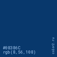 Цвет #08386C в цветовой модели RGB обозначается тремя октетами (8, 56, 108) в десятичном формате и #08386C в шестнадцатиричном (hex) формате, которые являются интенсивностью красного 8 (hex 08), интенсивность зелёного 56 (hex 38) и интенсивность синего 108 (hex 6C).