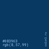 Цвет #083963 в цветовой модели RGB обозначается тремя октетами (8, 57, 99) в десятичном формате и #083963 в шестнадцатиричном (hex) формате, которые являются интенсивностью красного 8 (hex 08), интенсивность зелёного 57 (hex 39) и интенсивность синего 99 (hex 63).