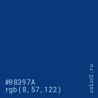 Цвет #08397A в цветовой модели RGB обозначается тремя октетами (8, 57, 122) в десятичном формате и #08397A в шестнадцатиричном (hex) формате, которые являются интенсивностью красного 8 (hex 08), интенсивность зелёного 57 (hex 39) и интенсивность синего 122 (hex 7A).