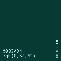 Цвет #083A34 в цветовой модели RGB обозначается тремя октетами (8, 58, 52) в десятичном формате и #083A34 в шестнадцатиричном (hex) формате, которые являются интенсивностью красного 8 (hex 08), интенсивность зелёного 58 (hex 3A) и интенсивность синего 52 (hex 34).