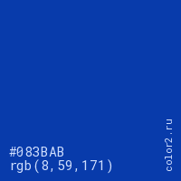 Цвет #083BAB в цветовой модели RGB обозначается тремя октетами (8, 59, 171) в десятичном формате и #083BAB в шестнадцатиричном (hex) формате, которые являются интенсивностью красного 8 (hex 08), интенсивность зелёного 59 (hex 3B) и интенсивность синего 171 (hex AB).