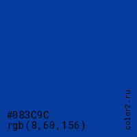 Цвет #083C9C в цветовой модели RGB обозначается тремя октетами (8, 60, 156) в десятичном формате и #083C9C в шестнадцатиричном (hex) формате, которые являются интенсивностью красного 8 (hex 08), интенсивность зелёного 60 (hex 3C) и интенсивность синего 156 (hex 9C).