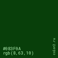 Цвет #083F0A в цветовой модели RGB обозначается тремя октетами (8, 63, 10) в десятичном формате и #083F0A в шестнадцатиричном (hex) формате, которые являются интенсивностью красного 8 (hex 08), интенсивность зелёного 63 (hex 3F) и интенсивность синего 10 (hex 0A).