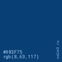 Цвет #083F75 в цветовой модели RGB обозначается тремя октетами (8, 63, 117) в десятичном формате и #083F75 в шестнадцатиричном (hex) формате, которые являются интенсивностью красного 8 (hex 08), интенсивность зелёного 63 (hex 3F) и интенсивность синего 117 (hex 75).