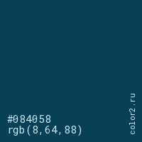 Цвет #084058 в цветовой модели RGB обозначается тремя октетами (8, 64, 88) в десятичном формате и #084058 в шестнадцатиричном (hex) формате, которые являются интенсивностью красного 8 (hex 08), интенсивность зелёного 64 (hex 40) и интенсивность синего 88 (hex 58).