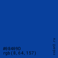 Цвет #08409D в цветовой модели RGB обозначается тремя октетами (8, 64, 157) в десятичном формате и #08409D в шестнадцатиричном (hex) формате, которые являются интенсивностью красного 8 (hex 08), интенсивность зелёного 64 (hex 40) и интенсивность синего 157 (hex 9D).