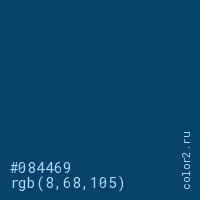 Цвет #084469 в цветовой модели RGB обозначается тремя октетами (8, 68, 105) в десятичном формате и #084469 в шестнадцатиричном (hex) формате, которые являются интенсивностью красного 8 (hex 08), интенсивность зелёного 68 (hex 44) и интенсивность синего 105 (hex 69).